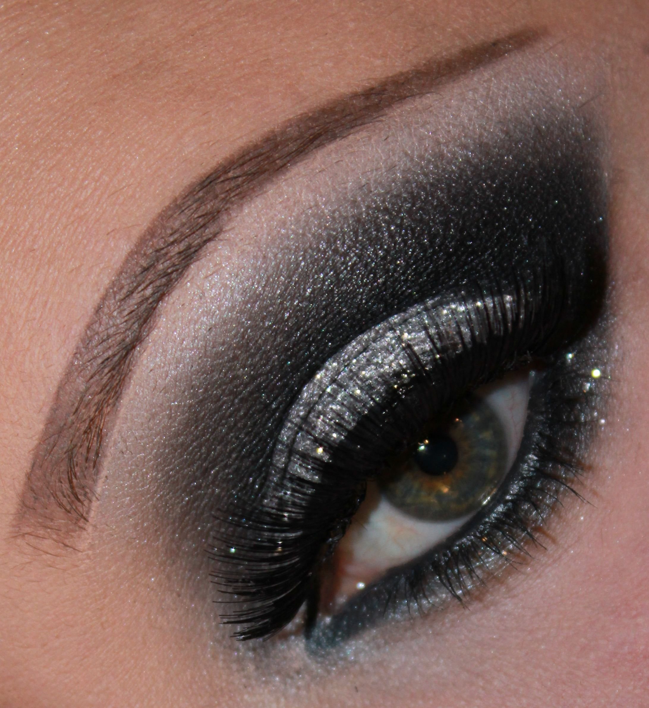 - Если у вас есть фиксатор для макияжа, слегка сбрызните им кисть и нанесите на веки немного черных блесток.