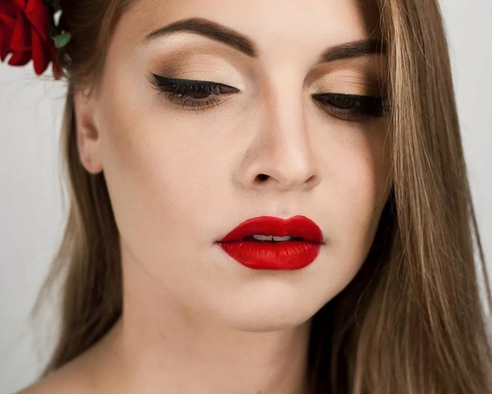 - На губы наносим яркий блеск или жидкую помаду. В видео использован красно-оранжевый оттенок, но вы можете использовать любой другой цвет, так как нейтральный макияж глаз будет прекрасно сочетаться даже с самым экстравагантным оттенком помады.