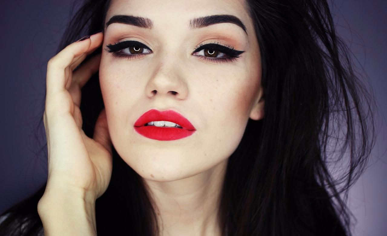 - Красим губы помадой бордового или насыщенно красного оттенка.