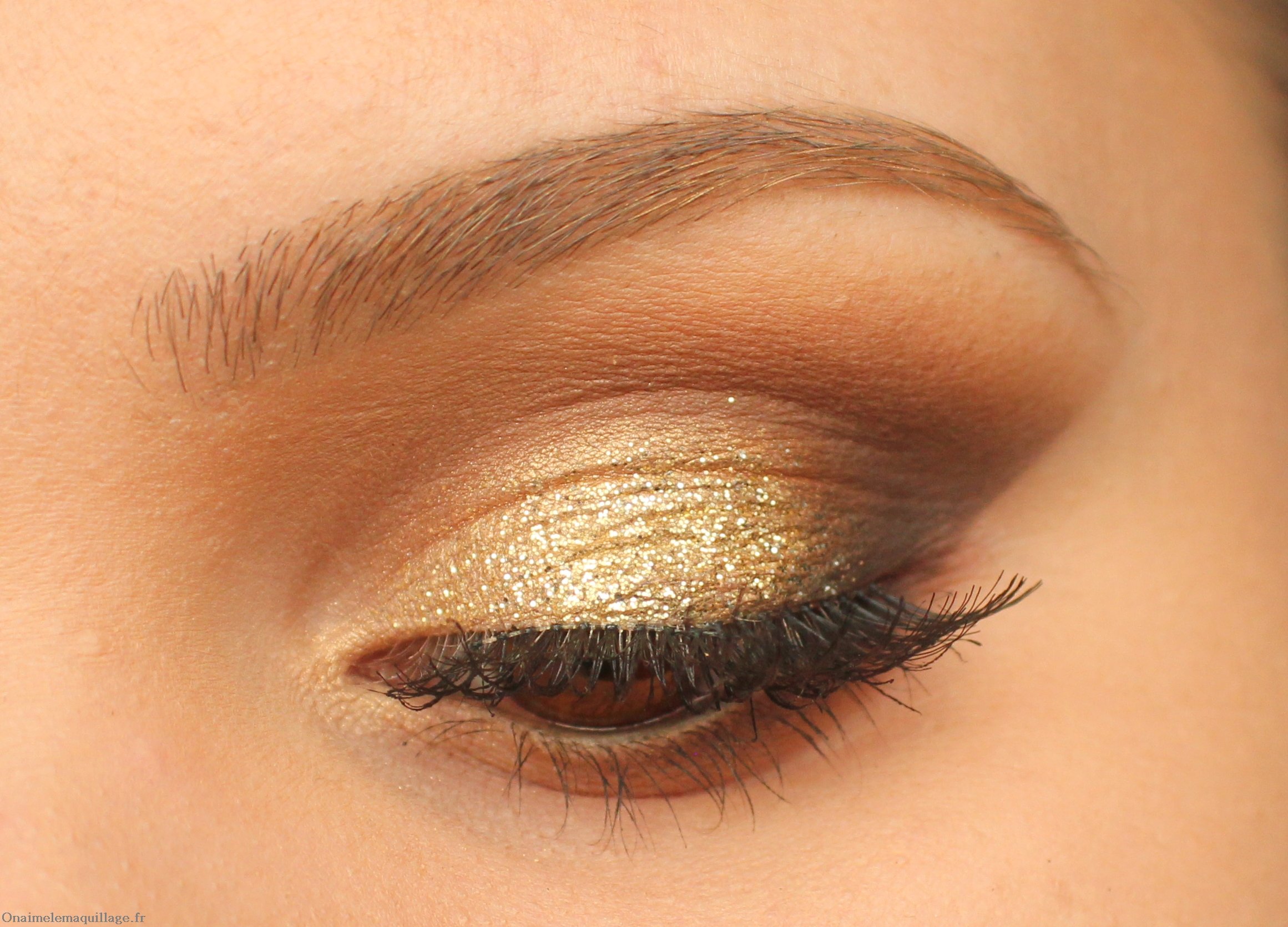 - Золотисто-бронзовые тени кладем на центр века и слегка растягиваем цвет в стороны.