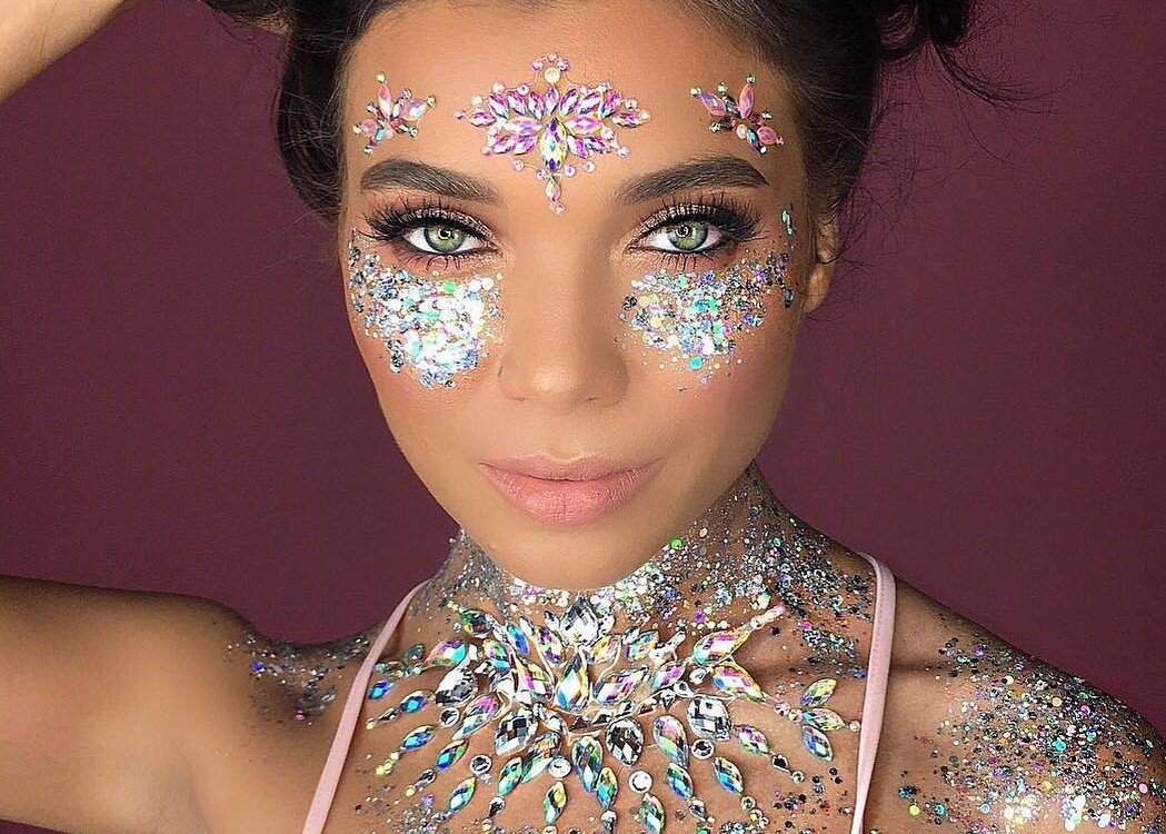 - Пришло время страз. Лучше использовать 3 вида: черные, черные меньшего размера, золотые меньшего размера. Сперва клеим, те что побольше вдоль линии роста ресниц. Садить стразы можно на клей для накладных ресниц. Только проследите, что бы он был прозрачным.На краю внутренней части глаза используйте стразы меньшего размера. То есть линия из страз должна сужаться к концу. Затем клеим стразы вверх по направлению к брови, и по линии складки, там, где заканчиваются черные тени. Выше черных страз клеим золотые, на коричневых тенях.