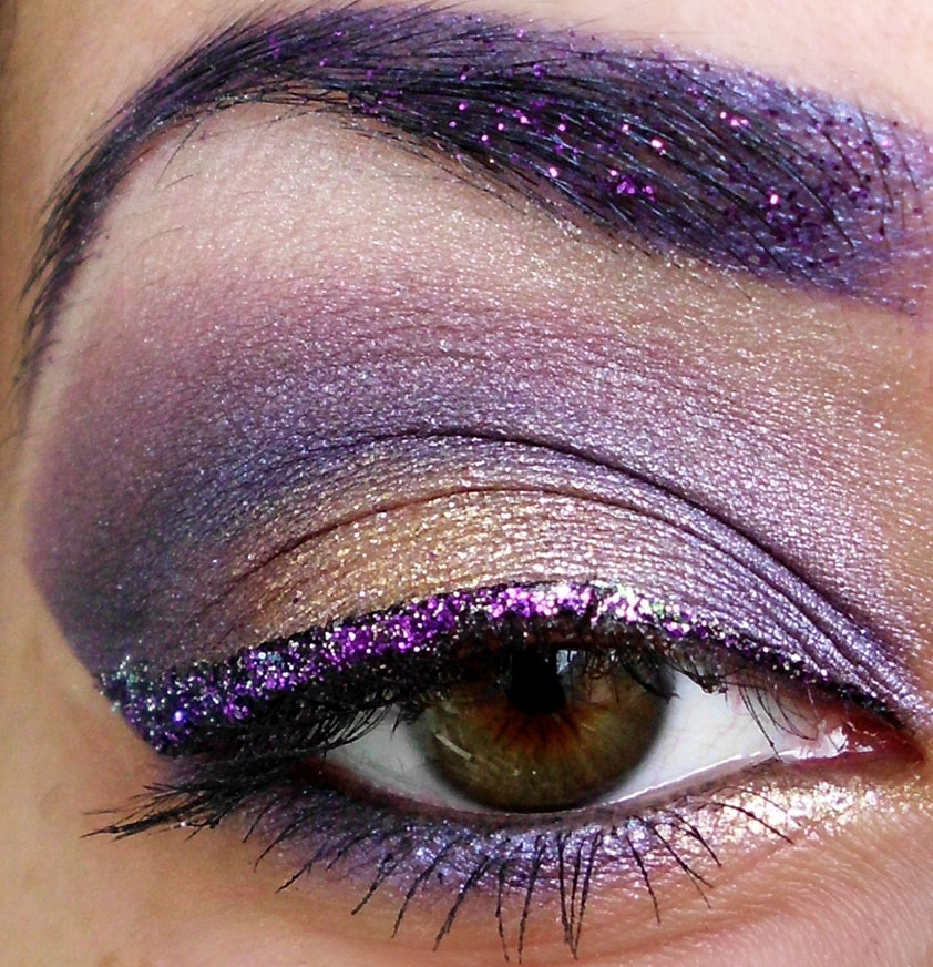 - Кистью, смоченной водой или специальной жидкостью для фиксации макияжа, превращаем темно-фиолетовый глиттер в подводку и рисуем стрелку. Также можно нарисовать стрелку обычным черным карандашом и сверху продублировать его фиолетовыми тенями.