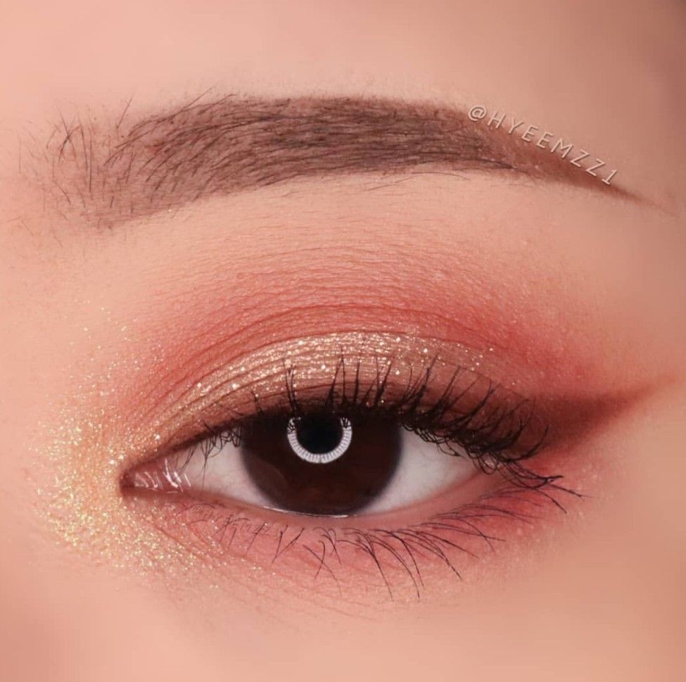 - Шиммерные тени персикового, розового или золотистого оттенка кладем на все подвижное веко, сверху можно добавить немного перламутровой пудры, чтобы усилить блестящий эффект.