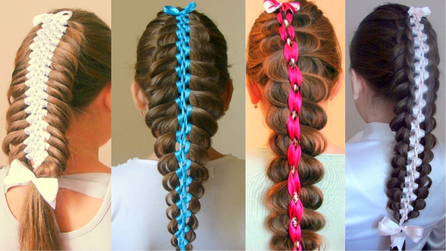 Ниже мы подобрали несколько видео, которые помогут быстро освоить этот образ. Суть создания можно описать всего в нескольких словах. Мы будем плести косичку из четырех прядей, причем можно использовать несколько техник, в первом видео прядь 1 и прядь 2 – это ленты, а 3 и 4 пряди – волосы, во втором и третьем видео, 1 прядь – лента, а 3 остальные волосы. Поэкспериментируйте и выберите лучший для вас вариант.
