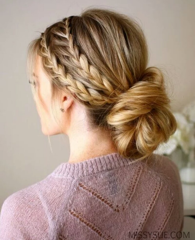8. Заверните правую косу на затылке и спрячьте ее концы под саму косу. Закрепите ее с помощью невидимок.