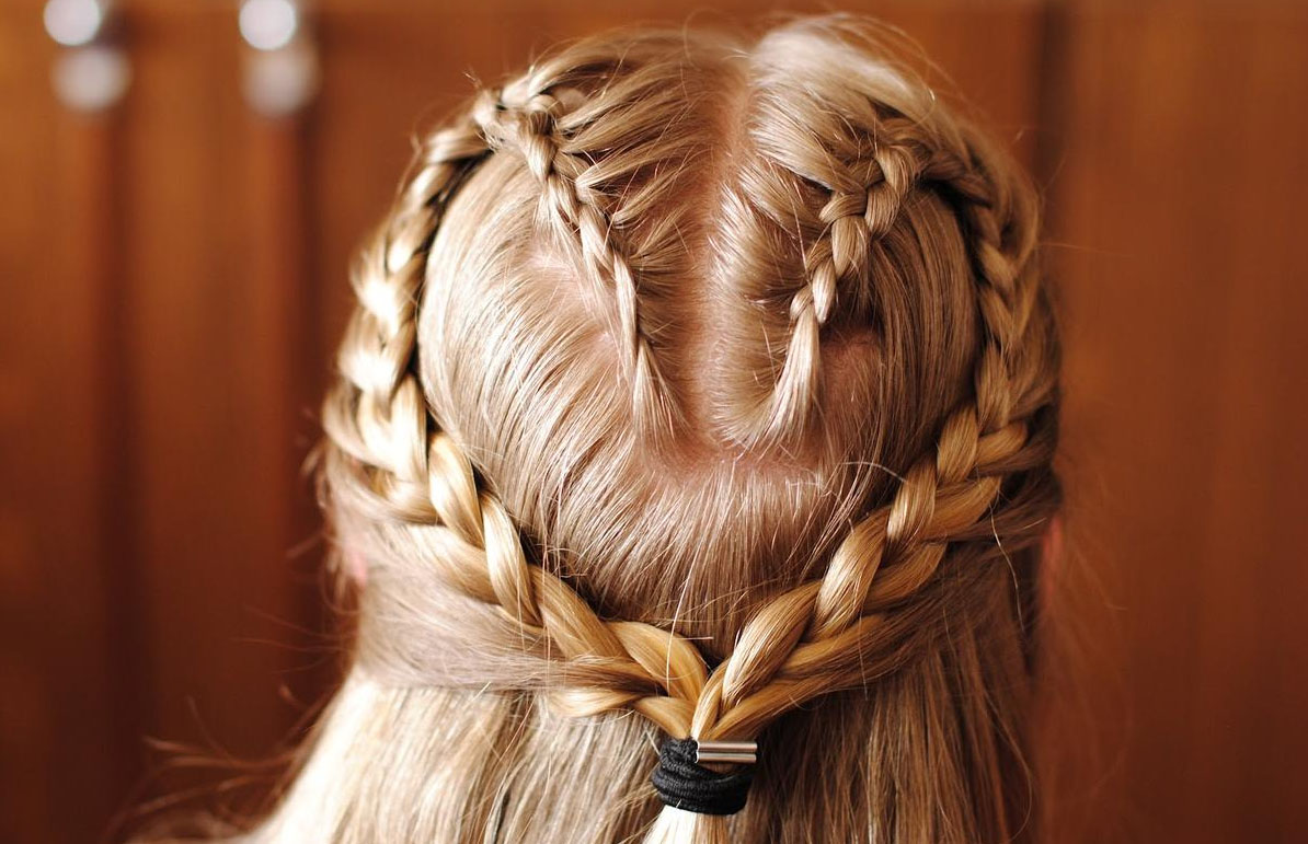 Сделайте пробор посередине. Возле пробора с одной из сторон возьмите небольшую прядь волос и начинайте плести голландскую косу, как описано выше. Но на этот раз не нужно вплетать все волосы, вплетите примерно половину, остальные оставьте распущенными. А косу доплетите до конца и закрепите резинкой. Сделайте тоже самое с другой стороны. Заведите обе косы назад и скрепите их резинкой. После этого можно распустить все волосы, ниже резинки, оставив такой своеобразный обруч из волос, либо же объединить две косы в красивый пучок-розочку, также скрепить его резинкой и приколоть одной или несколькими невидимками.