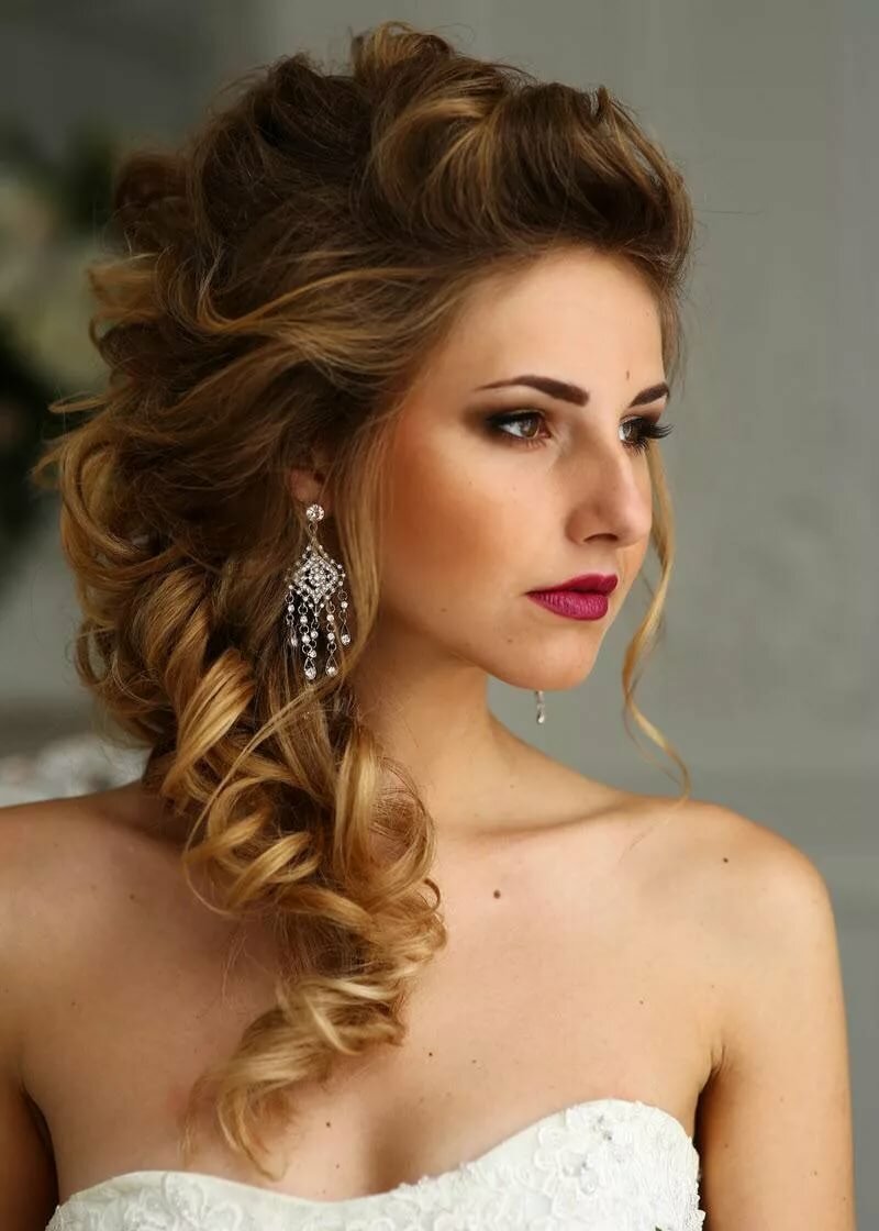 Эта вечерняя прическа на бок гламурная, модная, легкая в исполнении. Подойдет для уверенной в себе девушки, женственной и сильной одновременно. Вы могли довольно часто видеть такой образ на знаменитостях, и это понятно – его можно сделать довольно быстро, самостоятельно и не нужно обладать какими-то специальными навыками. Челка в этой прическе укладывается на сторону и добавляет образу больше выразительности. Еще варианты причесок на вечер.