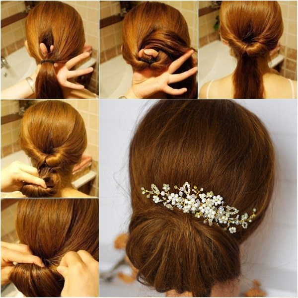 - Сделайте высокий хвост, завяжите его резинкой. Стяните резинку немного вниз, и начинайте подворачивать хвост внутрь, под резинку и переднюю часть волос. Спрячьте все волосы и закрепите их гребнем.